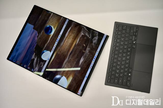듀얼 스크린 노트북의 화면 간 단절은 ‘하이드어웨이 힌지(Hideaway Hinge)’ 설계를 통해 개선됐다. 화면을 완전히 펼쳤을 때 하단 패널의 베젤 일부가 힌지 내부로 말려 들어가는 구조를 채택해 상하 화면 사이의 간격을 최소화했다. 두 개의 3K OLED 패널을 하나의 큰 작업 공간으로 활용할 때 시선이 끊기는 현상을 줄여준다. 내장된 킥스탠드와 180도 펼쳐지는 힌지 구조는 별도의 거치대 없이도 상하 배치 모드나 공유 모드 등으로 활용 가능하다.