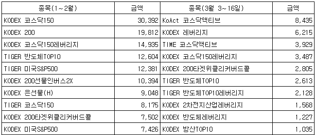 18일 금융정보업체 에프앤가이드에 따르면 올해 1∼2월 개인들이 가장 많이 순매수한 ETF는 KODEX코스닥150과 KODEX200으로, 두 달간 각각 3조392억원과 1조9천812억원어치를 순매수했다.