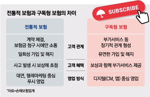 다만 구독형 보험이 안착되기 위해서는 규제 개선이 필요하다. 현행 보험업법 시행령에 명시된 ‘특별이익 제공 금지’ 원칙이 대표적이다. 보험사는 1년간 납입 보험료의 10%와 3만원 중 적은 금액을 초과하는 혜택을 가입자에게 줄 수 없다. 헬스케어, 법률 서비스, 렌탈 등 다양한 이종 산업과 결합해야 하는 구독형 보험 특성상 3만원이라는 상한선은 지나치게 낮다는 지적이다.