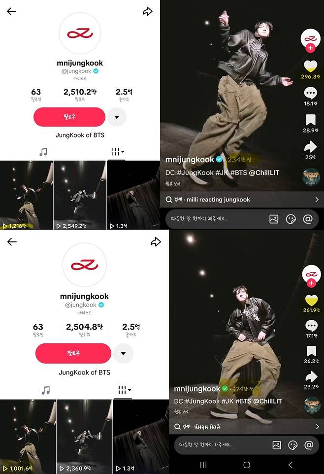 인기도 숫자로 바로 확인됐다. 정국의 해당 댄스 영상은 17시간 만에 조회수 1000만, 좋아요 261만 개를 기록했다. 23시간 만에는 조회수 1210만, 좋아요 296만 개를 얻었다. 짧은 영상 하나가 또 한 번 압도적인 화제성을 보여준 것이다.
