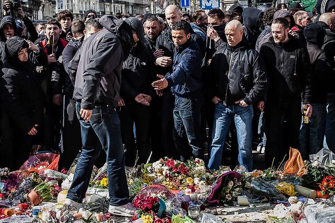 | ▲ 2016년 3월 27일 일요일, 벨기에 브뤼셀 증권거래소 광장(Place de la Bourse)의 '브뤼셀 테러 추모 현장'에서 극우 시위대가 시위를 벌이고 있는 모습. 한 시위자가 시민들이 희생자들을 추모하기 위해 놓고 간 꽃을 밟고 있다. |