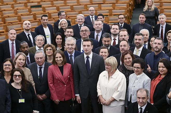 | ▲ 프랑스 국민연합(RN) 대표이자 유럽의회 내 '유럽을 위한 애국자'(극우성향 정치그룹) 의장인 조르당 바르델라(가운데)와 유럽의회 의원이자 유럽을 위한 애국자 제1부대표인 킹가 갈(가운데 오른쪽)이 2024년 12월 6일 헝가리 부다페스트 의회 건물에서 열린 유럽을 위한 애국자 회의 중 단체 사진 촬영을 하고 있다. |