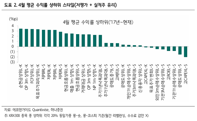하나증권은 실적 상향 팩터가 통상 6월까지 우상향하는 경향이 뚜렷한 만큼, 단기적으로는 실적 가시성이 높은 종목 중심의 대응이 유효하다고 짚었다. 아울러 4월부터는 저평가·고배당주로의 자금 재유입, 사업보고서 제출에 따른 옥석 가리기, 기관 중심 순환매 등이 맞물리며 저평가 종목의 반등 가능성도 크다고 판단했다.