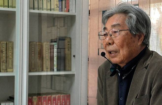 | ▲ 시대의 격랑을 겪으며 문학의 길을 걸어온 문순태 작가. '타오르는강문학관'을 찾은 독자들에게 자신의 굴곡진 삶과 문학 이야기를 하고 있다. |