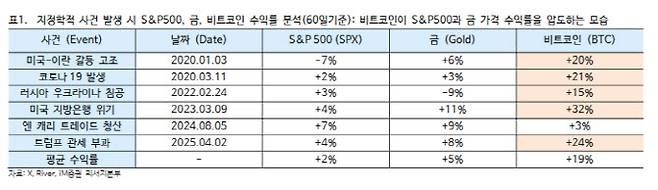 반면 비트코인은 최고점 대비 약 50% 하락을 경험하며 가격 부담이 상당 부분 완화된 상태에서 지정학적 사건 발생 이후 비트코인이 S&P500과 금 대비 상대적으로 높은 수익률을 기록해왔다는 경험적 내러티브가 확산되면서 최근 매수세가 유입된 것으로 판단된다는 게 양 애널리스트의 설명이다.