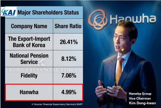 As a result, Hanwha Aerospace has become KAI's fourth-largest shareholder. The current largest shareholder is the Export-Import Bank of Korea (Korea Eximbank), holding a 26.41% stake, followed by the National Pension Service (NPS) at 8.12%, and Fidelity Management & Research Company LLC and 38 other foreign investors at 7.06%.