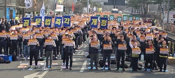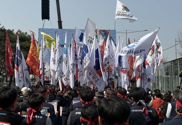 양대노총(한국노총, 민주노총) 공공부문 노동조합 공동대책위원회(양대노총 공대위)는 17일 오후 2시부터 서울 여의도 국회 정문 앞에서 '공공부문 노정교섭 실현을 위한 총력 투쟁 결의대회'를 개최했다. 이날 집회 모인 3000여 명의 공공부문 노동자들은 '일방통행 거부, 노정교섭 쟁취'가 적힌 손팻말을 들었다.