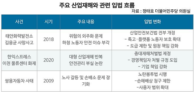 다만, 처벌 강화만으로는 한계가 있다고 봤다. 정 의원은 “중대재해처벌법 도입 당시에는 최고경영자에게 책임을 묻으면 사고가 줄어들 것이라는 기대가 있었다”며 “하지만 실제로는 산재가 줄지 않았고, 권한 없는 사람을 책임자로 앉혀 실질적인 책임자가 회피하는 왜곡된 현상도 나타났다”고 지적했다.