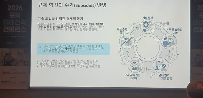 이 교수는 일본의 기술 도입과정에서 겪은 시행착오를 특히 강조했다. 지난 2010년대 일본 정부는 수백억 엔 규모의 보조금을 투입해 최첨단 로봇을 도입했지만 충격적으로 상당수가 요양원 창고에 방치되는 결과를 겪게 됐다고 한다.