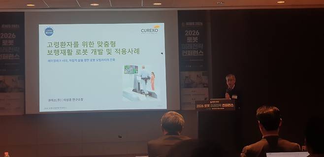 | ▲ 이상훈 소장 이상훈 큐렉소 연구소장은 ‘고령환자를 위한 맞춤형 보행재활 로봇 개발 및 적용사례’에 관해 강연했다. |