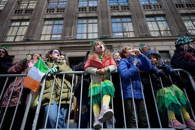[뉴욕=AP/뉴시스] 17일(현지 시간) 미국 뉴욕에서 한 소녀가 가족과 함께 성 패트릭 데이 퍼레이드를 구경하면서 환호성을 지르고 있다. 2026.03.18.