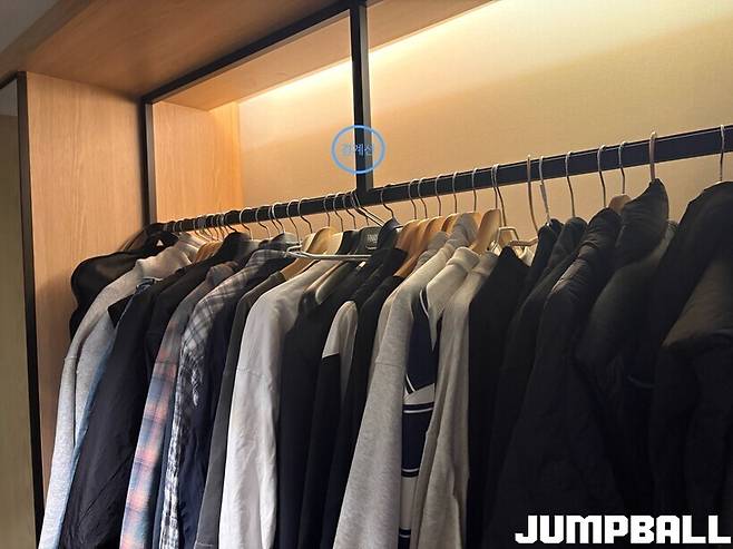 가졌던 궁금증도 해소됐다. 그런 후 “이제 방 소개를 본격적으로 해드리겠습니다”라고 외친 신지원. 그가 맨 처음 가리킨 곳은 남북 군사분계선(?)이다. 바로 강지훈과 구역을 나눠 정리를 해둔 호텔방의 행거다. 어느 것이 내 옷인가를 구분하는 데 있어, 큰 어려움을 없게 한 군사분계선이다. 옷과 신발, 수건들로 가득 차 있었지만, 정리가 아주 잘 되어있기도 했다.
