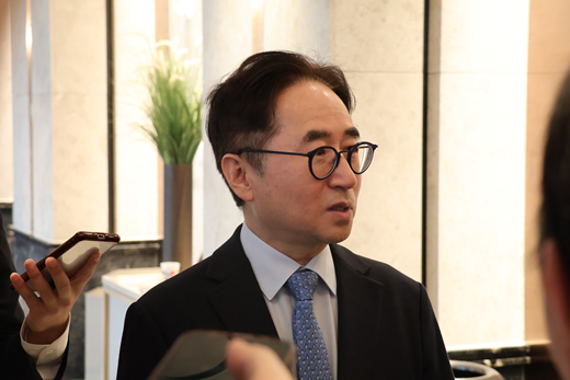 장덕현 삼성전기 사장이 18일 서울 양재동 엘타워에서 열린 제53기 삼성전기 정기 주주총회가 끝난 뒤 기자들과 만나 질의응답을 진행했다. (사진=이명신 기자)