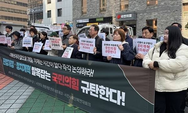 시민주도 헌법개정 전국 네트워크(시민개헌넷)·시민사회단체연대회의는 17일 오전 10시부터 서울 여의도 국민의힘 당사 앞에서, 오전 10시 30분부터 더불어민주당 당사 앞에서 기자회견을 통해 "헌법개정과 정치개혁 국회 논의가 국회 논의는 더디기만 하다"며 "여야가 논의하고 즉각 이행하라"고 촉구했다.