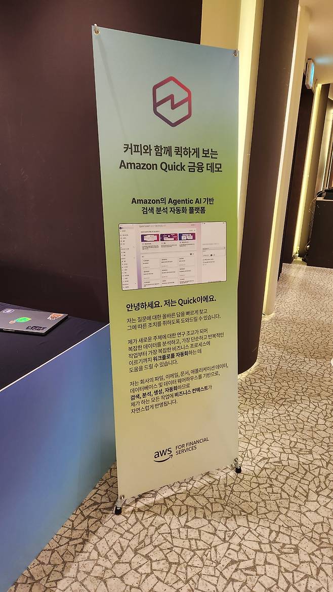 이날 AWS는 자체 SaaS 프로그램인 ‘아마존 퀵(Amazon Quick)’의 데모를 시연(사진)했다. ‘퀵’은 AI 기반 검색 분석 자동화 플랫폼으로, 비개발직군도 자연어로 명령해 데이터를 분석하고 대시보드화할 수 있는 기능을 갖췄다. 현장에 마련된 시연 존에서는 고객 데이터 분석과 재무 지표 비교 등 직무별 데이터 활용 사례가 구현됐으며, 금융사 실무자들이 직접 시스템을 조작해보기도 했다.