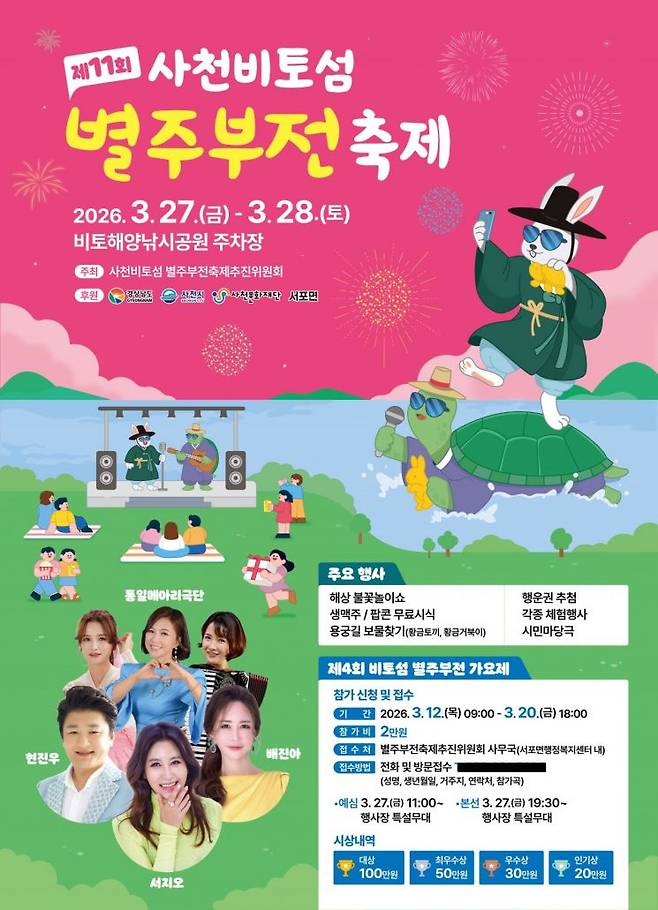 경남 사천시 사천 비토섬 별주부전 축제 추진위원회는 「제11회 사천 비토섬 별주부전 축제」를 오는 3월 27일부터 3월 28일까지 이틀간 서포면 비토 해양 낚시공원 일원에서 개최한다고 18일 밝혔다.