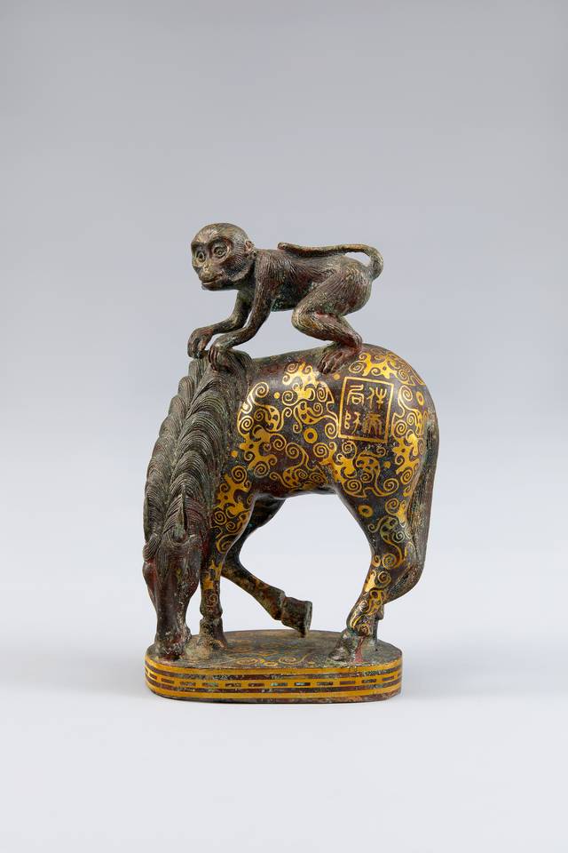 우선 눈에 띄는 청동 금상감 마상봉후상(馬上封侯像)은 춘추전국시대 유물이다. 말에 올라탄 원숭이가 곧바로 제후에 봉해졌다는 기막힌 의미를 담고 있다. 그 연대의 아득함으로 인해 감탄이 나오는데, 말과 원숭이의 모습이 웃음을 자아내기도 한다. 말 네 마리가 마차를 끄는 모습으로 조각된 옥기도 춘추전국시대에 만들어졌다.