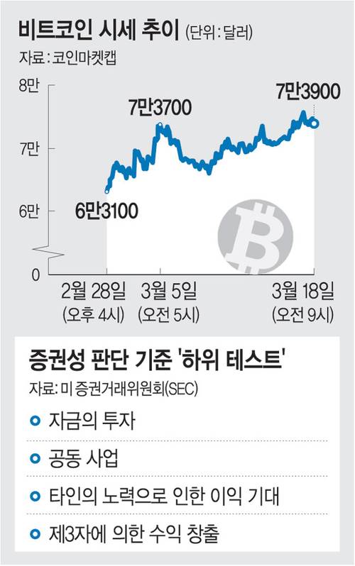 미 증권거래위원회(SEC)가 17일(현지시간) 비트코인 등 대부분의 가상자산에 대해 증권성이 없다고 해석한 것은 주식·채권·파생결합증권·투자계약증권 등과 달리 ‘타인의 경영 노력에 따른 수익 기대’란 조건이 충족되지 않는다고 판단했기 때문이다. 10년 넘게 이어져 온 ‘증권인가 상품인가’라는 논란에 대한 답이 나오면서 규제 불확실성이 해소되고 기관 자금이 본격 유입될 수 있다는 기대가 나온다.