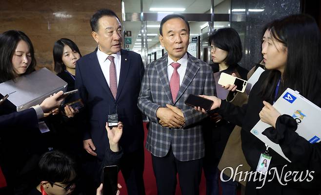 | ▲ 국민의힘 충북 지역 국회의원인 박덕흠(오른쪽), 엄태영 의원이 18일 오전 서울 여의도 국회 당대표실을 찾아 장동혁 대표에게 충북도지사 선거 경선 관련 입장을 전달한 뒤 기자들의 질문에 답변하고 있다. |