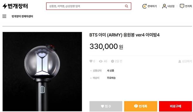 대표적으로 'BTS 아미(ARMY) 응원봉 ver4'는 미개봉 제품 기준 33만원에 등록됐다. 공식 판매가가 약 4만9천원인 점을 감안하면 6배 이상 높은 가격이다. 같은 제품으로 50만원대에 등록된 아미밤 묶음 세트는 이미 거래되거나 예약이 완료됐다.