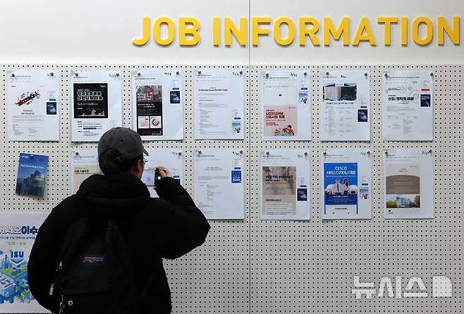 [서울=뉴시스] 이영환 기자 = 한 학생이 18일 서울 성북구의 한 대학교 일자리플러스센터 일자리정보 게시판에서 채용공고를 살펴보고 있다.