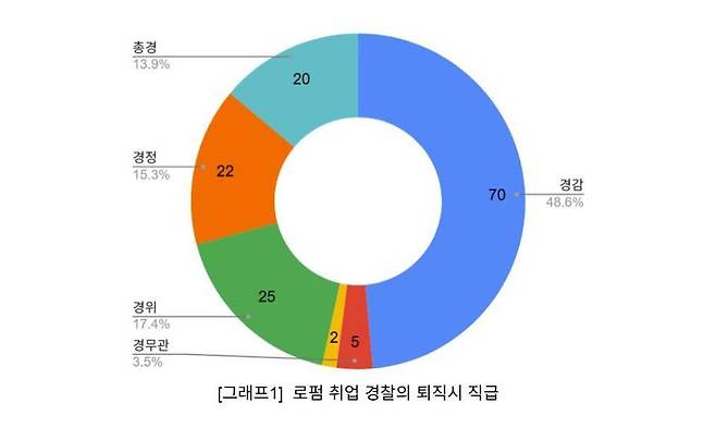 경찰 퇴직 시 직급은 주로 일선 경찰서의 과장·팀장에 해당하는 경감(70명·48.6%)이 가장 많았습니다. 이어 경위(25명), 경정(20명), 총경(20명) 순이었습니다.