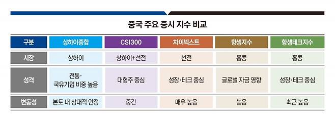 중국의 미래 성장성을 보기 위해선 CSI300, 차이넥스트, 항셍테크 지수 등을 확인해야 한다. 이 중 기관투자가들이 더 자주 참고하는 지수는 CSI300이다. 상하이와 선전 증시에 상장된 대형주 300개를 묶은 지수로 중국판 코스피200에 비유된다. CSI300은 본토 대형주의 전반적인 흐름을 보여주는 지표로 활용된다. 금융주뿐 아니라 소비·산업·테크 기업이 함께 포함돼 있어 중국 증시의 체력을 가늠하는 데 상대적으로 적합하다.