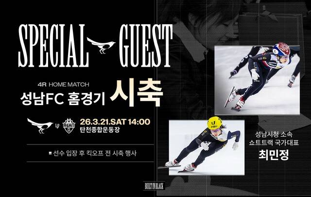 성남 FC는 오는 21일 탄천종합운동장에서 열리는 하나은행 K리그2 2026 4라운드 충남아산 FC(이하 충남아산)와의 홈경기에 쇼트트랙 스타 최민정 성남시청 선수를 시축자로 초청한다.