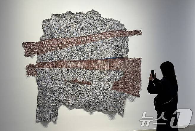 (서울=뉴스1) 박지혜 기자 = 18일 서울 강남구 화이트 큐브 서울에서 열린 세계적인 설치미술가 엘 아나추이의 개인전 'LuwVor'에서 관람객이 작품을 살펴보고 있다.