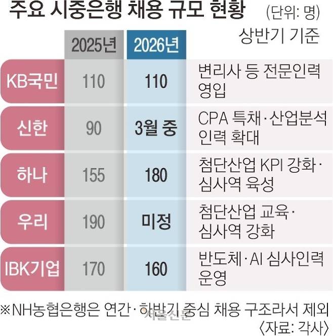 18일 금융권에 따르면 KB국민은행은 올해 상반기 110명 규모의 신입행원 공채를 진행한다. 하나은행은 신입·경력·보훈 특별채용 등을 포함해 180명을 선발하고, IBK기업은행은 160명을 채용해 전년보다 소폭 줄였다. 신한은행은 이달 중 공채를 진행할 예정이며 우리은행도 채용을 검토하고 있다. 전반적으로 공채 규모는 큰 변화 없이 유지되는 분위기다.
