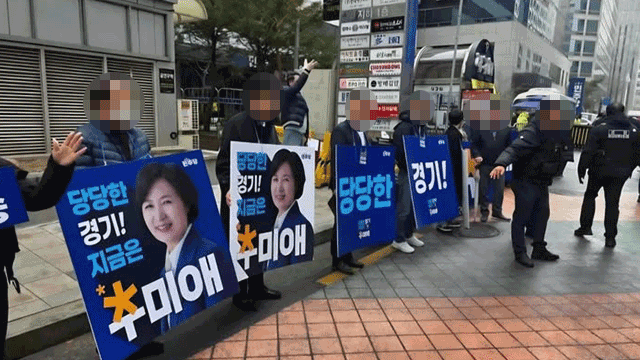 당시 추 예비후보 지지자들은 서울 여의도 민주당사 앞 보도에서 추 예비후보 얼굴과 이름이 들어간 가로 100cm, 세로 100cm 크기 홍보 팻말을 들고 있었습니다. 신고는 이게 "불법 사전선거운동"이라는 내용이었습니다.
