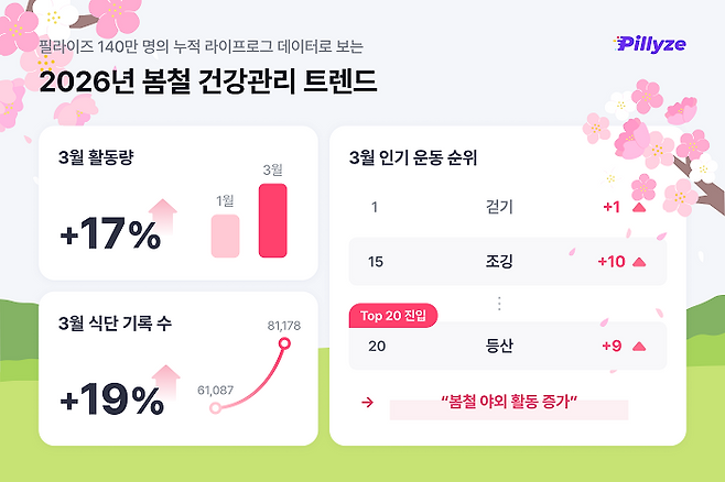 AI 기반 웰니스 플랫폼 필라이즈(대표 신인식)가 누적 이용자 140만 명의 라이프로그 데이터를 분석한 결과, 야외 활동량의 증가가 식단 관리 및 영양 분석 기록의 동반 상승으로 이어지는 상관관계를 확인했다고 18일 밝혔다.