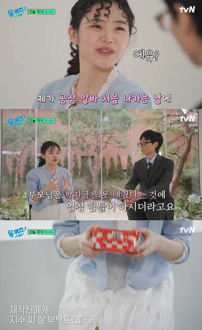 이에 최지수는 "제가 공장 알바 처음 나가는 날에"라고 운을 떼다가 눈시울을 붉혔다.