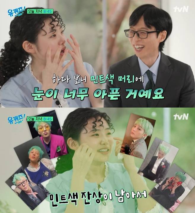 최지수는 "집 갈 때 전철에서 잔다. 그런데 눈을 감았는데도 민트색 머리 잔상이 남더라"라고 덧붙여 유재석의 웃음을 자아냈다.