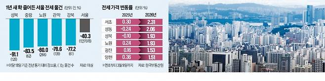 1년 동안 전세 물건이 많이 줄어든 곳은 성북구(-91.1%), 중랑구(-83.5%), 노원구(-80.0%) 등이었다. 1주일 전과 비교하면 강남 3구(강남·서초·송파구), 마용성(마포·용산·성동구) 등 핵심지 전세 감소세가 두드러졌다. 1주일 새 송파구 전세 물건은 3178건에서 2873건으로 9.6% 줄었다.