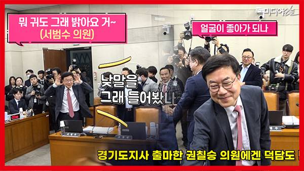고동진 국민의힘 의원도 윤호중 장관과 악수하며 “모두들 열심히 했다. 우리가 숫자가 적으니까 먹히질 않네요. 어쩔 수 없죠”라며 “차관이 법안소위 하느라 수고 많았다”고 말했다. 영상엔 행안위 산회 후 서로 악수하며 수고했다는 덕담을 나누는 장면 등이 담겼다.