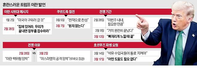 동맹을 호르무즈해협에 불러들이려는 구상이 불과 사흘 만에 철회되자 미국이 이란 전쟁과 관련해 ‘큰 그림’이 있는지 의구심이 커지고 있다. 트럼프 대통령은 개전 초반에는 전쟁 목표로 이란 정권 교체를 언급했다. 하지만 이후 핵무기 개발 능력, 탄도미사일 등으로 계속 바뀌었다. 종전 시기도 처음에는 며칠에서 최장 4주로 거론됐으나 이달 말로 예정된 미·중 정상회담을 연기하는 등 전쟁이 한 달 이상 이어질 것으로 전망된다. 전쟁 초반 주요 관심사이던 쿠르드족 참전에 관해서도 트럼프 대통령은 “전적으로 찬성하고 훌륭하다”고 밝힌 다음 날 “원하지 않는다”고 말했다.