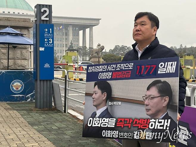 | ▲ 이화영 전 부지사 변호인 김광민 변호사가 국회 앞에서 1인 시위를 하고 있다. 2025.12.17 |