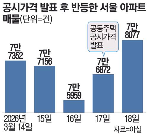 18일 부동산 빅데이터 업체 아실에 따르면 이날 기준 서울 아파트 매물은 7만8077건으로 집계됐다. 국토교통부가 공시가격안을 발표하기 전인 16일 대비 이틀 만에 2118건(2.7%) 늘어난 수치다. 앞서 국토부가 공시가격안 공개 일정을 밝힌 13일 이후 서울 아파트 매물 수는 소폭 감소 중이었다. 14일 7만7352건이었던 매물이 16일에는 7만5959건까지 줄어들었으나 발표를 기점으로 다시 늘어나기 시작한 것이다.