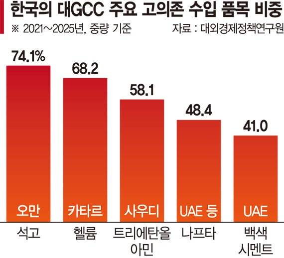 실제 한국의 공급망 구조는 김 장관이 지적한 '3U' 리스크가 그대로 드러나는 형태다. 원유의 약 70%를 중동에서 들여오는 가운데, 이 중 상당 물량이 호르무즈해협을 통해 수송되는 구조는 지정학적 충돌 시 언제든 차질이 발생할 수 있는 '불안정' 상태를 보여준다. 여기에 석고(74.1%), 헬륨(68.2%), 트리에탄올아민(58.1%) 등 주요 산업 원자재가 특정 지역(GCC)에 집중된 구조는 공급차질과 가격변동을 사전에 가늠하기 어려운 '불확실' 상태로 이어진다. 수출통제나 물류차질 등 외부변수 하나만으로도 수급과 가격이 급변할 수 있기 때문이다.