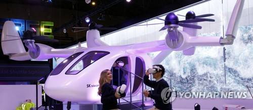 지난 2023년 모바일 월드 콩그레스(MWC 2023) 개막을 앞두고 SK텔레콤 전시관에서 조비 에비에이션의 기체를 기반으로 제작한 실물 크기의 도심항공교통(UAM) 모형을 체험하고 있다.