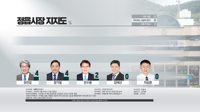 유진섭 전 정읍시장과 장기철 전 더불어민주당 정읍지역위원장은 각각 4%, 안수용 사회적기업 사단법인 둘레 이사장이 2%, 김재선 현 덕산그룹 회장과 차승환 현 더불어민주당 정책위원회 부의장은 각각 0%에 수렴했습니다. '모름·무응답'은 2%, '지지하는 사람이 없다'는 응답은 9%입니다.