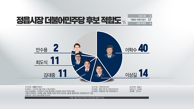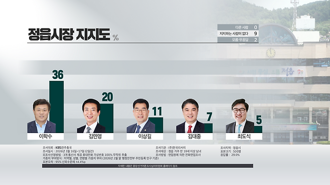 이학수 현 정읍시장이 36%로 가장 높았고, 김민영 전 정읍산림조합장이 20%로 뒤를 이었습니다. 이상길 현 제9대 정읍시의회 의원이 11%, 김대중 전 제 9·11대 전라북도의회 의원이 7%, 최도식 전 청와대 대통령비서실 행정관이 5%입니다.