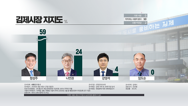 김제시장에 출마한 4명의 후보에 대한 지지도도 살펴봅니다.