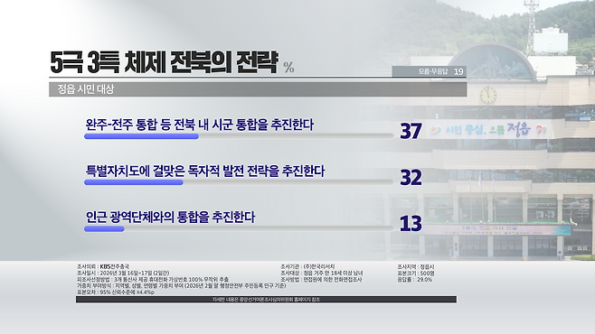 5극 3특 체제 속 전북의 전략을 묻는 물음에는 전북 내 시군 통합이 37%, 독자적 발전 전략 추진이 32%로 나타났습니다.