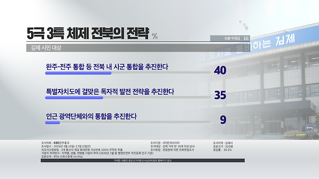 전북 내 시군 통합을 추진해야 한다는 응답이 40%, 독자적 발전 전략 추진은 35%로 나타났습니다.