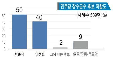 더불어민주당 후보 적합도 조사에서는 최 군수가 50%로 가장 높았고 양 전 의원이 40%로 뒤를 이었다. 없음·모름·무응답은 9%였다.