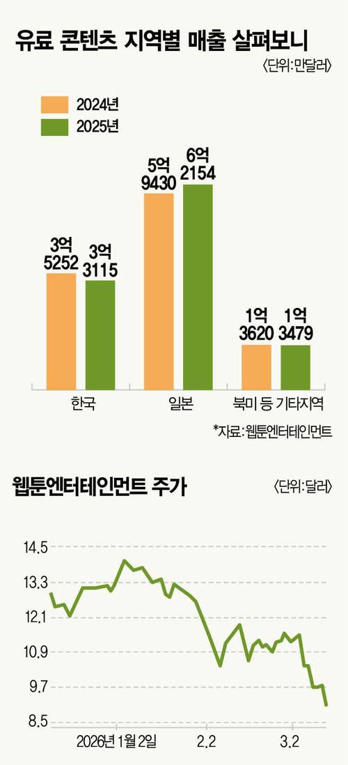 네이버웹툰 모회사 웹툰엔터테인먼트에 켜진 ‘적신호’가 좀처럼 꺼지지 않는 모양새다. 일단 성장세는 눈에 띄게 둔화했다. 지난해 매출 증가율은 한 자릿수 초반에 머물렀고, 적자 구조도 벗어나지 못했다. 주요 사업에서는 예상치를 밑돈 사업 성과 탓에 대규모 영업권·무형자산 손상차손도 발생했다. ‘아시아의 디즈니’라는 별명이 무색하게 한국·일본 시장 의존도 역시 여전하다.