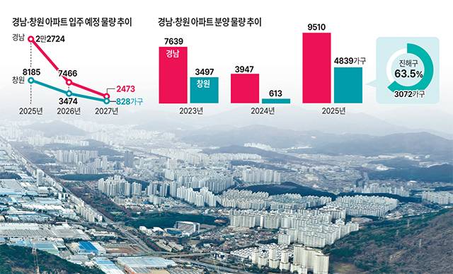 창원의 사정도 다르지 않다. 지난해에는 11개 단지 8185가구가 입주를 마쳤지만 올해는 58%가 줄어든 3개 단지 3474가구로, 입주 물량이 반토막 난다. 심지어 내년(2027년)에는 단 2개 단지, 828가구에 그칠 정도로 공급이 메말라버린다.