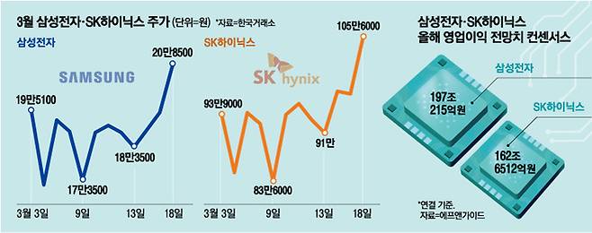에프앤가이드에 따르면 삼성전자와 SK하이닉스의 올해 영업이익 전망치는 한 달 전보다 각각 4.63%, 2.52% 높아졌다.